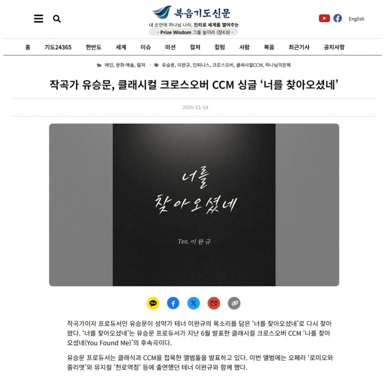 [기사] 작곡가 유승문, 클래시컬 크로스오버 CCM 싱글 ‘너를 찾아오셨네’(복음기도신문)