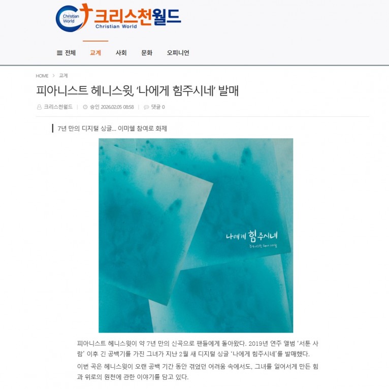 뮤직타임 [기사] 피아니스트 헤니스윗, ‘나에게 힘주시네’ 발매(크리스천월드)
