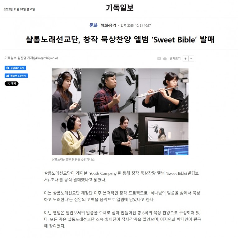 뮤직타임 [기사] 샬롬노래선교단, 창작 묵상찬양 앨범 ‘Sweet Bible’ 발매(기독일보)